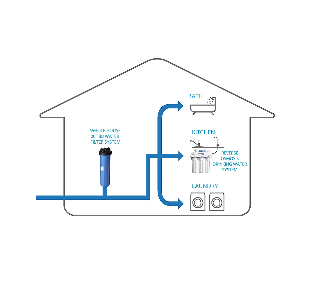 - يتم تركيبه في الخزان العلوي لسطح المنزل ليصبح نظيف تماما لاستخدامات الاستحمام والغسيل وازالة الكلور والشوائب