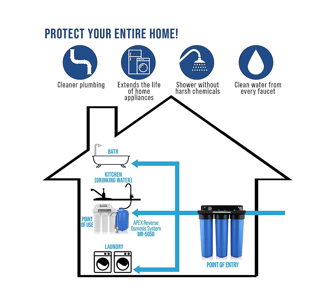 - يتم تركيبه في الخزان العلوي لسطح المنزل ليصبح نظيف تماما لاستخدامات الاستحمام والغسيل وازالة الكلور والشوائب