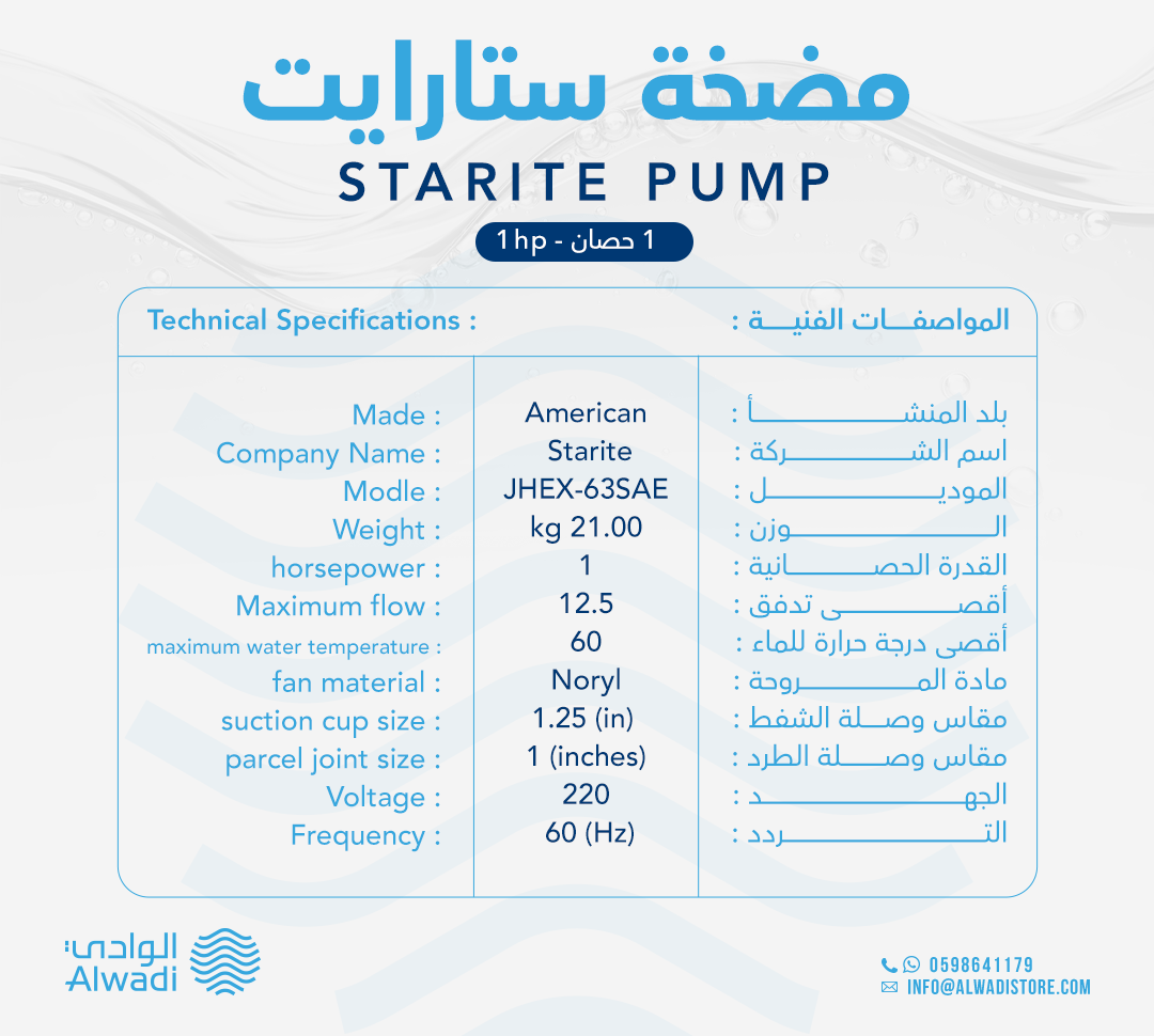 مضخة ستارايت سمنان 1 حصان 220 فولت 1 فاز موديل JHEX63SAE مصممة لضخ الم